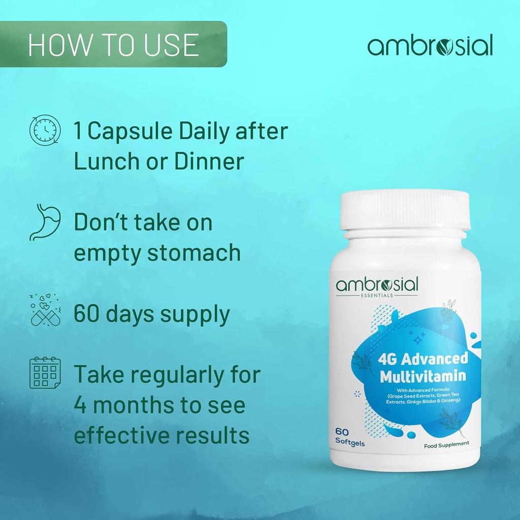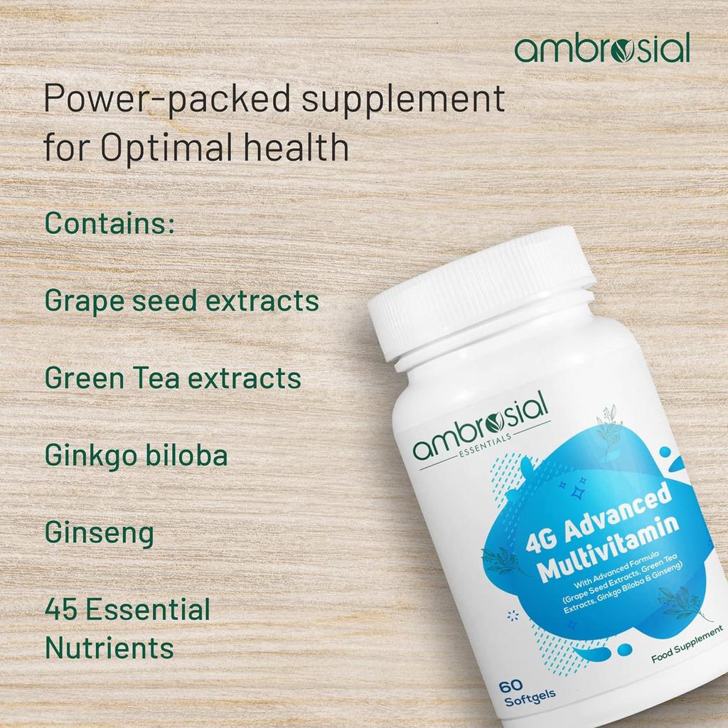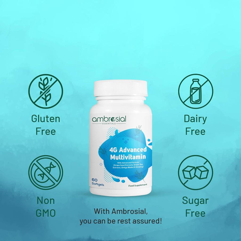 AMBROSIAL 4GAvanced Multivitamin для мужчин высокой концентрации для женщин с 45 основными витаминами и минералами, женьшень зеленый, чай, витамины B12, B7, B9, D3 (Упаковка из 1-60 мягких капсул)
