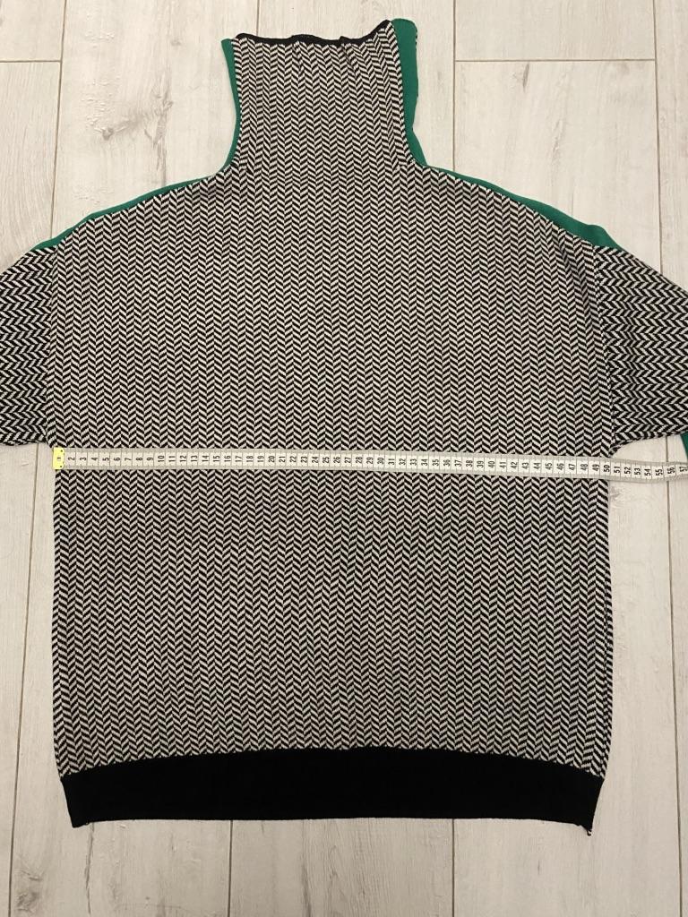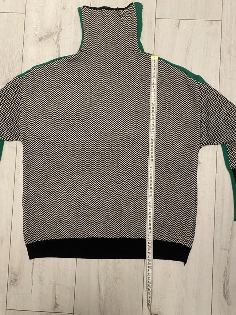 Вещь понравилась. Трикотаж плотный, мягкий, расцветка соответствует. Горловина немного длинная, на мой взгляд. Рукава хорошей длины. Сам свитер короткий