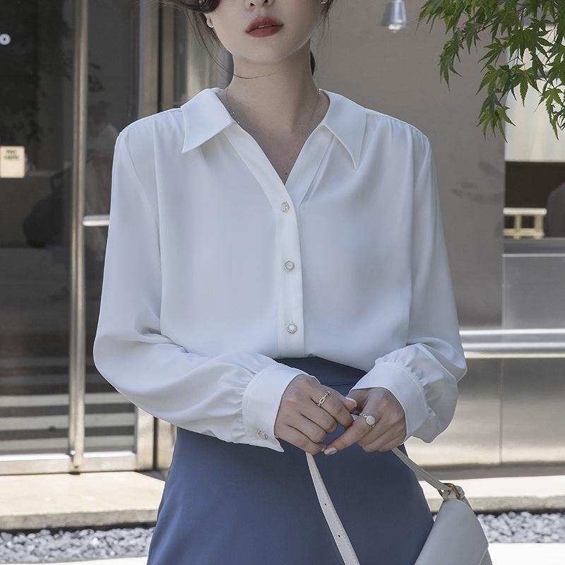 Белая рубашка, женские блузки и рубашки с длинным рукавом, весенний наряд OL Professional Commuting French Pleated V-образный вырез, элегантный топ