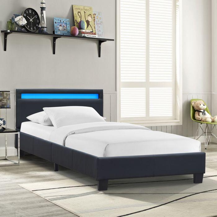Angel - Solide et Confortable Lit 90x200 avec Sommier Tte de Lit avec Eclairage LED Couleur NOIR Pieds en 10