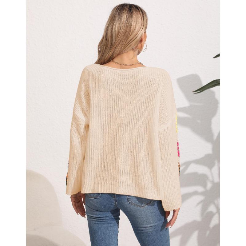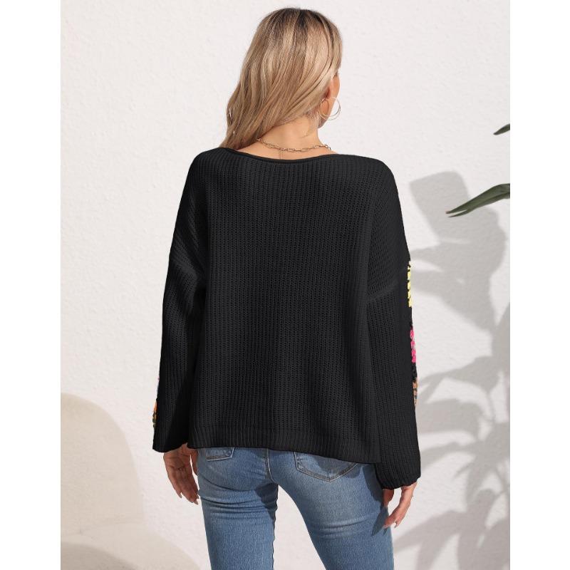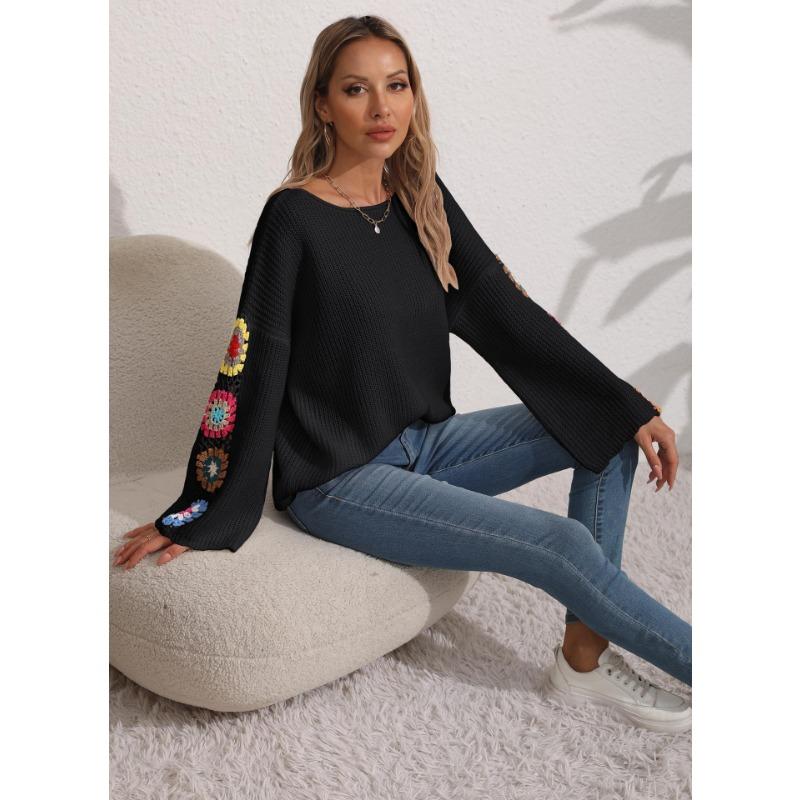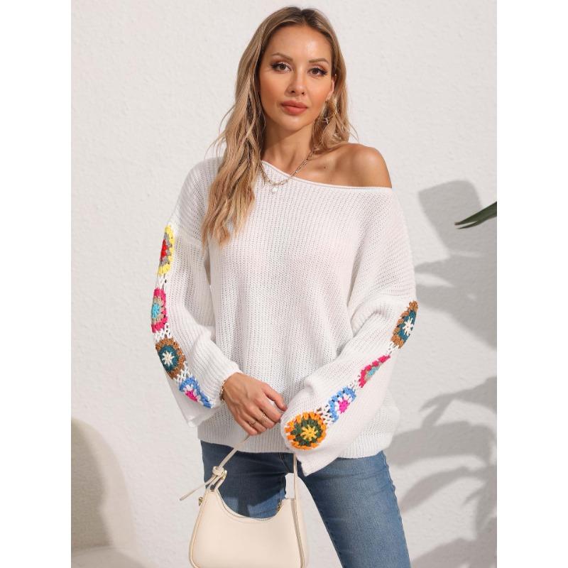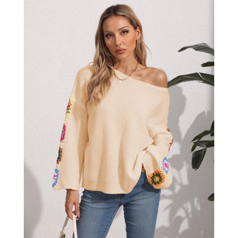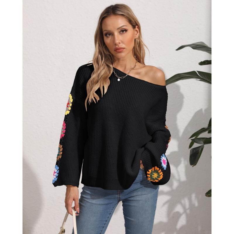 Женский свитер свободного кроя с открытыми плечами и воротником-стойкой, разноцветный, с цветочным узором