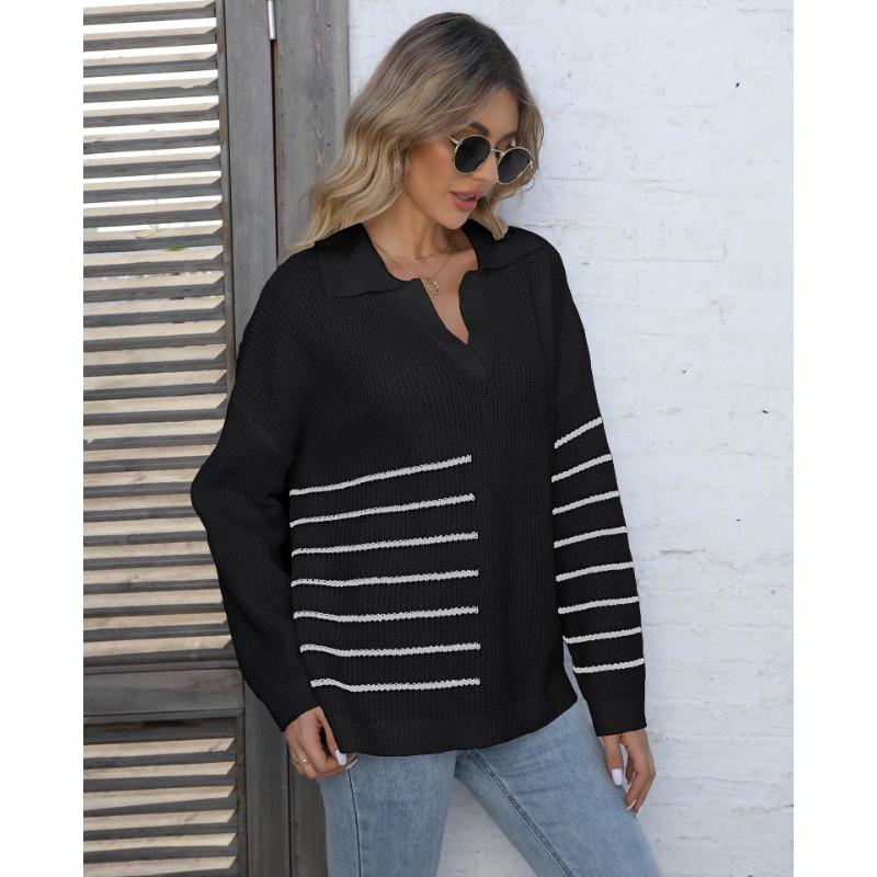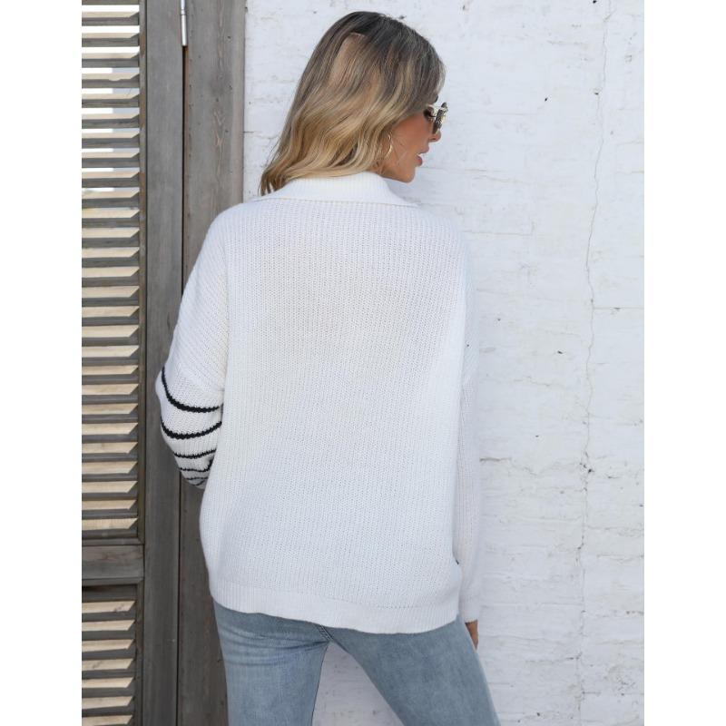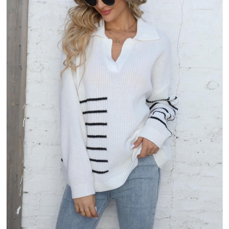 Женский свитер осень-зима с контрастными полосками и воротником-поло