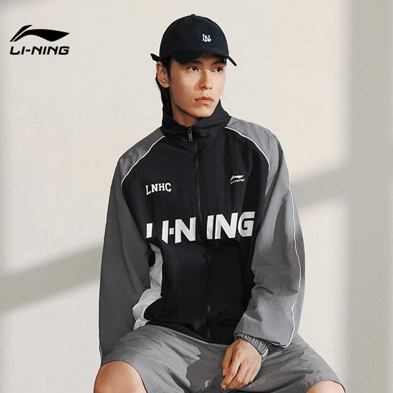 Li-Ning Ветрозащитная водоотталкивающая цветная блочная буква принт свободный воротник спортивная куртка на молнии унисекс куртка черная AJDT741-1