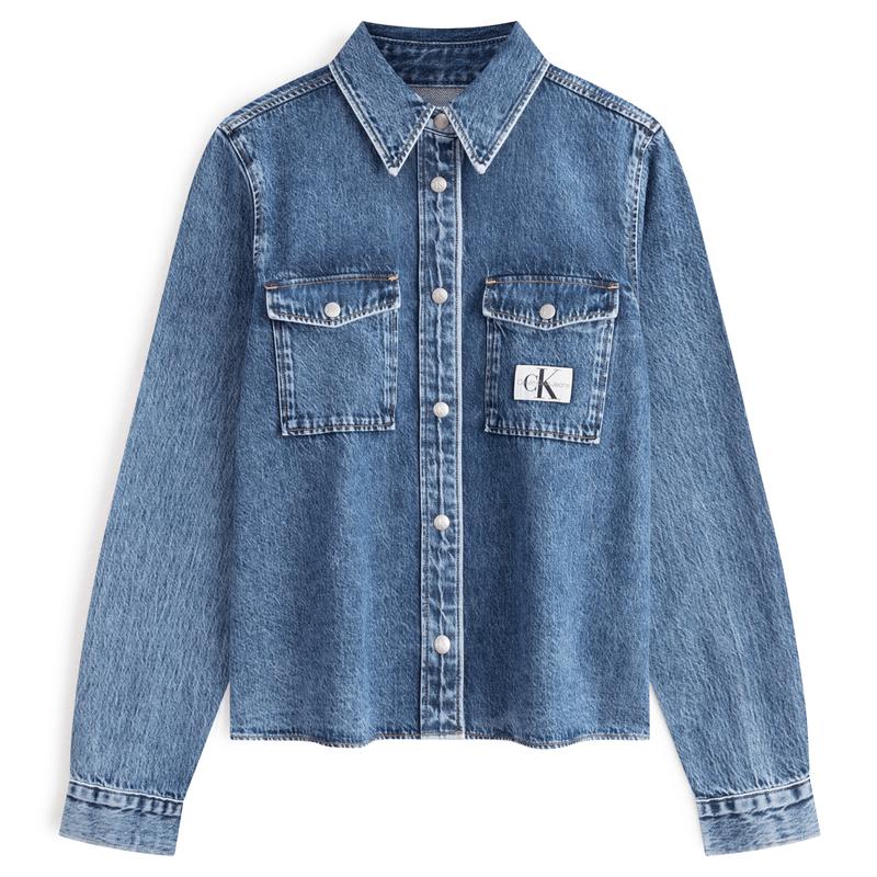 Женская рубашка Calvin Klein из чистого хлопка с вышивкой в виде нашивки с надписью, из выстиранного денима, с длинными рукавами, светло-голубая, J223851 — купить товар онлайн с бесплатной доставкой по всему миру!