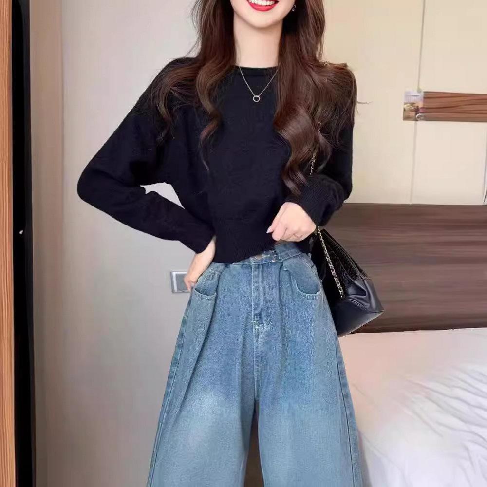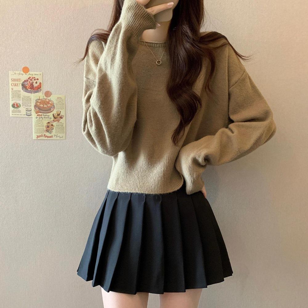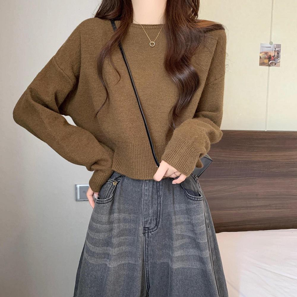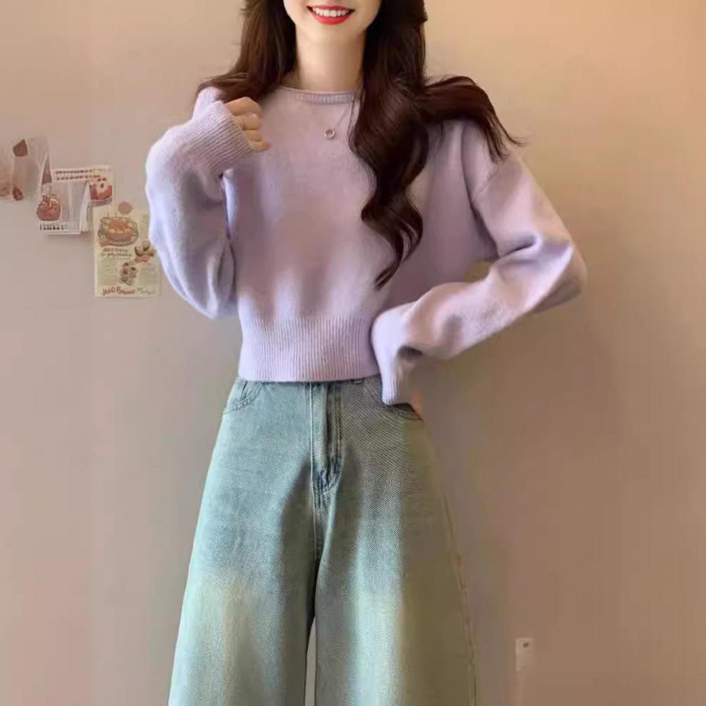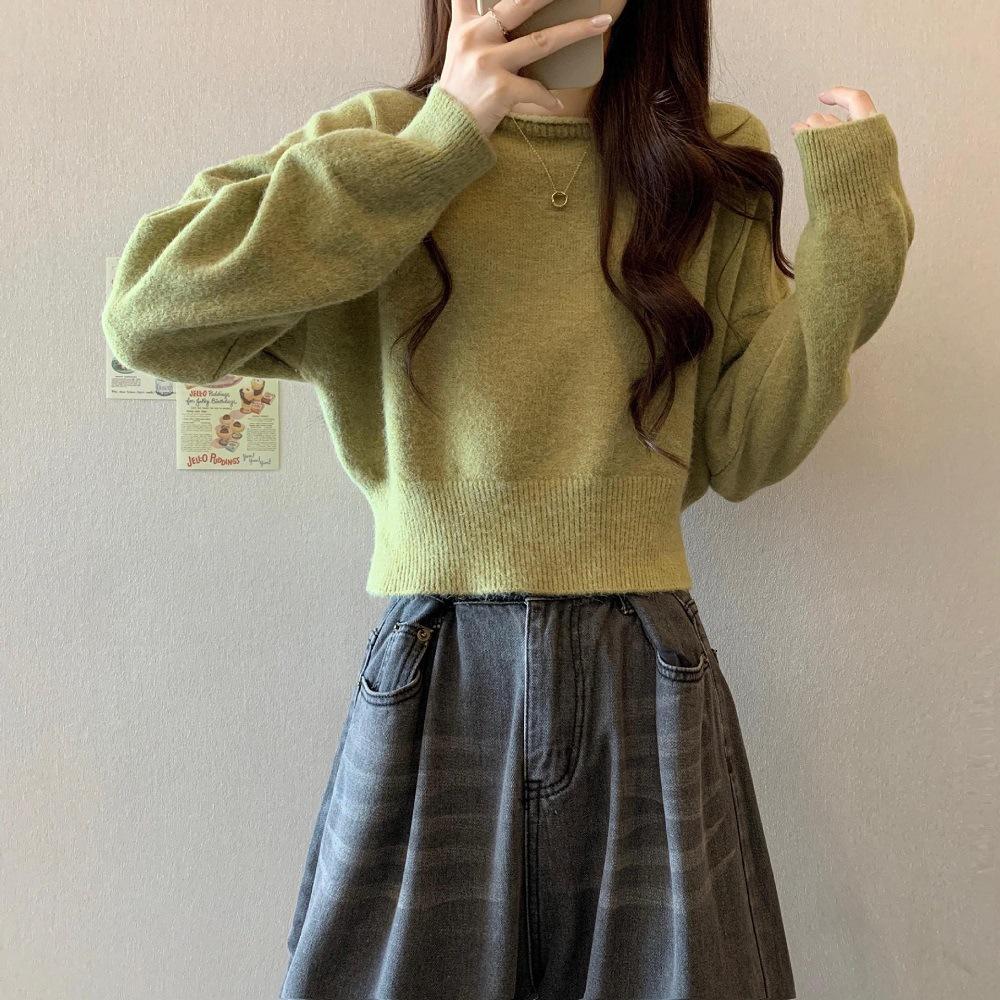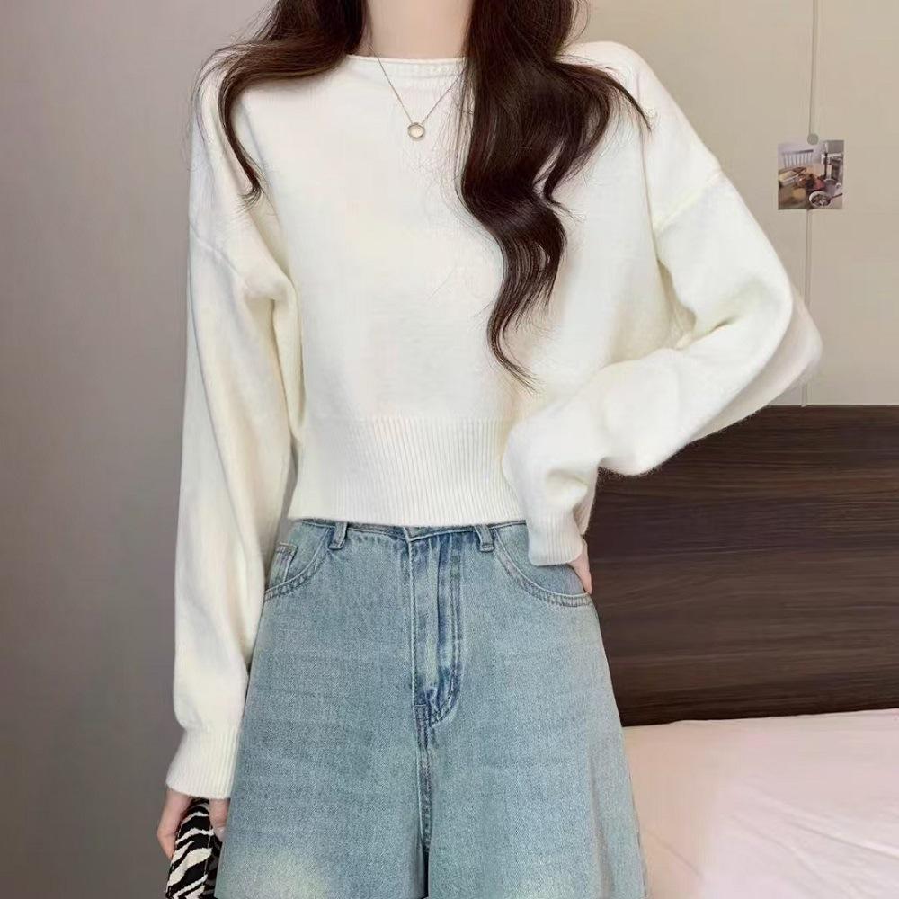 WTEMPO Женские короткие трикотажные свитера с круглым вырезом и длинным рукавом на весну и осень, повседневные свободные однотонные теплые свитера