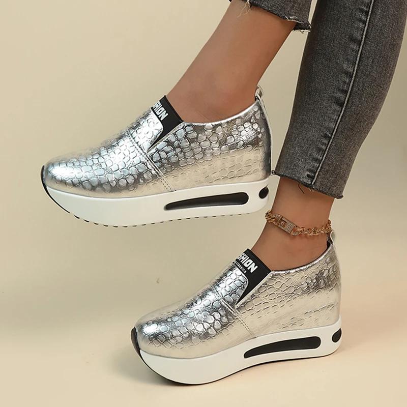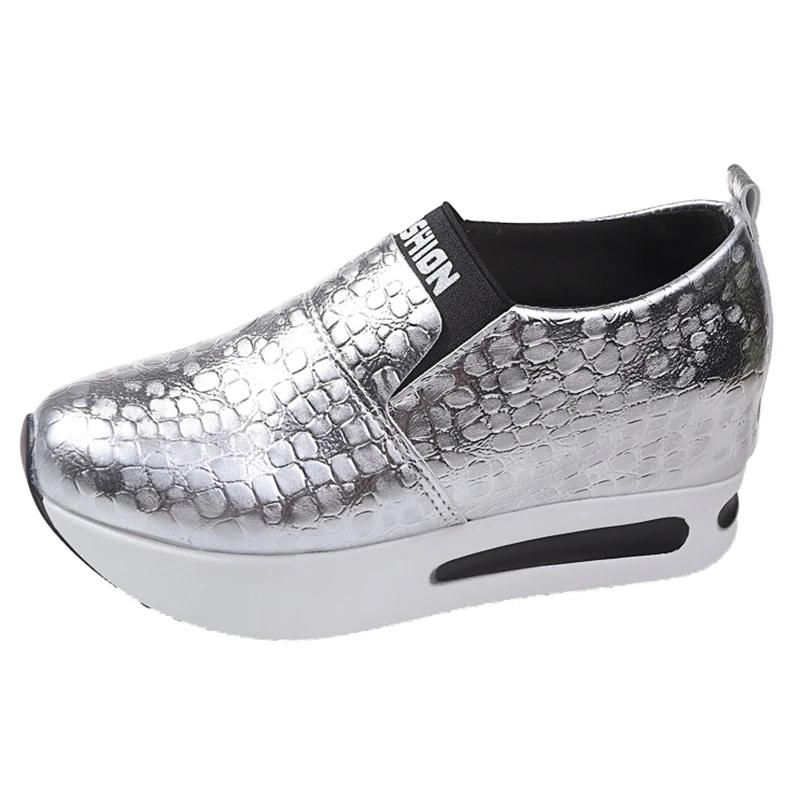 Серебряные золотые кроссовки со змеиным узором женские весенние кроссовки для увеличения роста женские туфли больших размеров из искусственной кожи