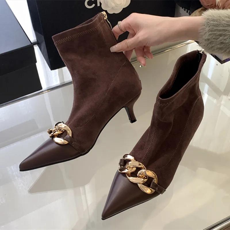Сексуальные ботильоны с острым носком на тонком низком каблуке для женщин, осенняя мода, отделка металлической цепочкой, кожа, бархат, дизайн, ботильоны