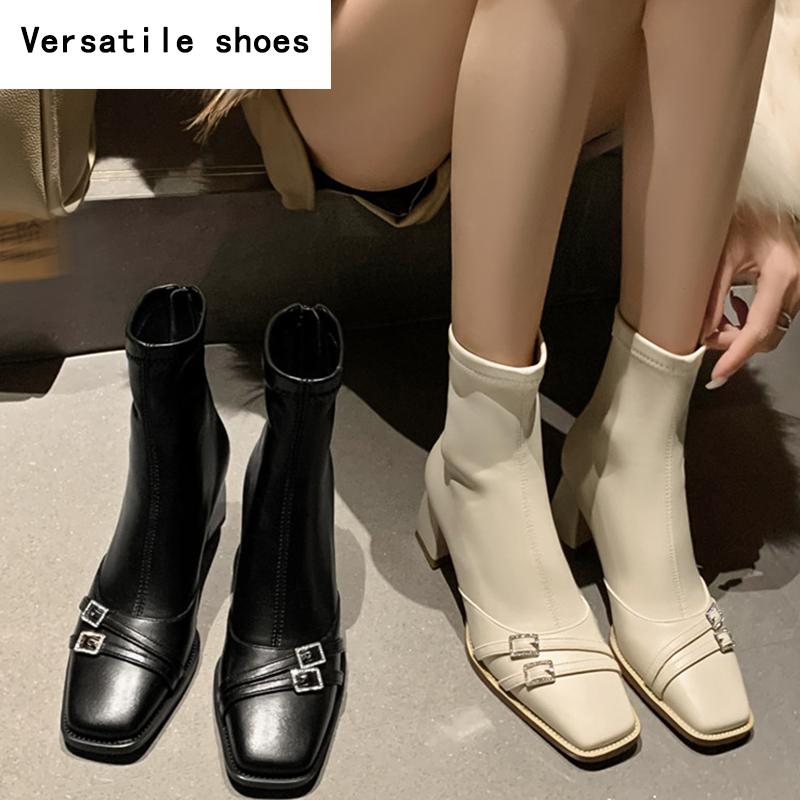 Ботильоны на толстом каблуке женские уличные узкие квадратные носки молния осень зима стразы женская обувь