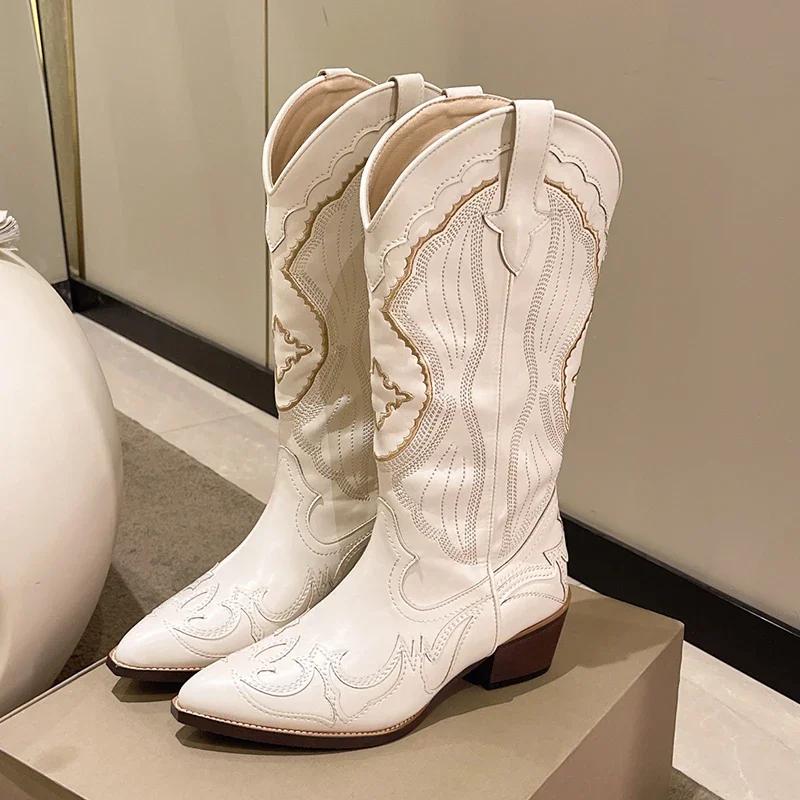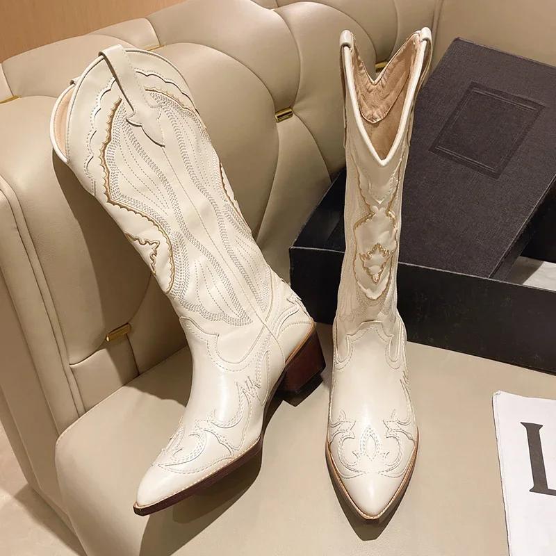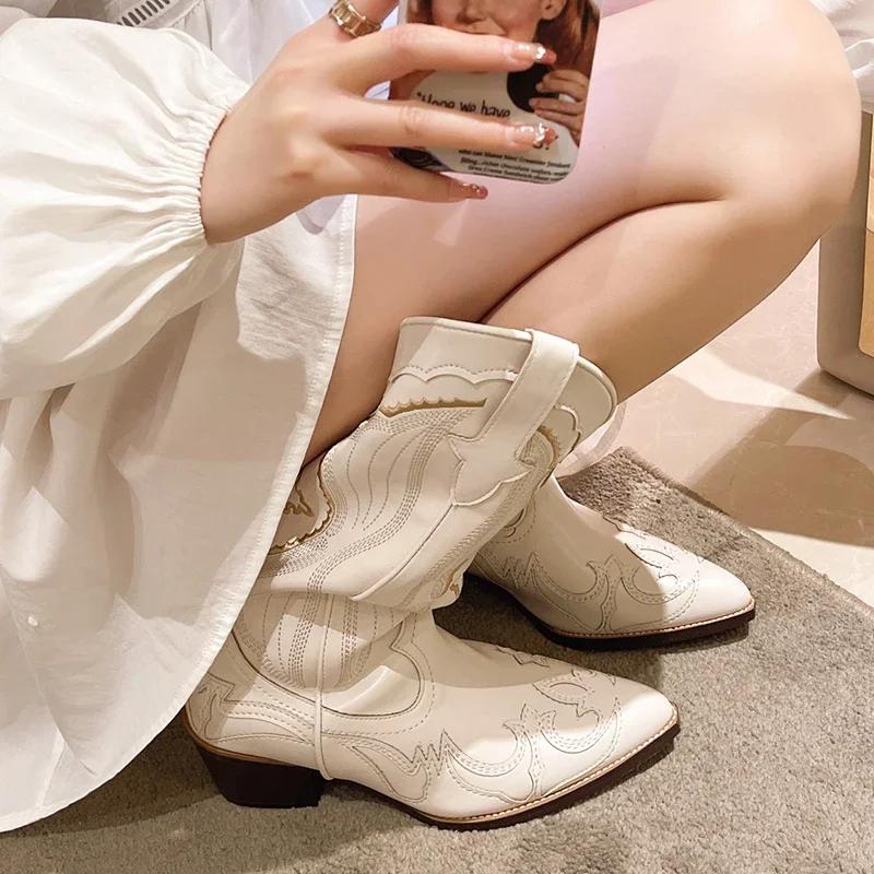 Белые ковбойские сапоги для женщин с вышивкой, с острым носком, до середины голени, женские ковбойские сапоги без застежек на толстом каблуке, женская обувь