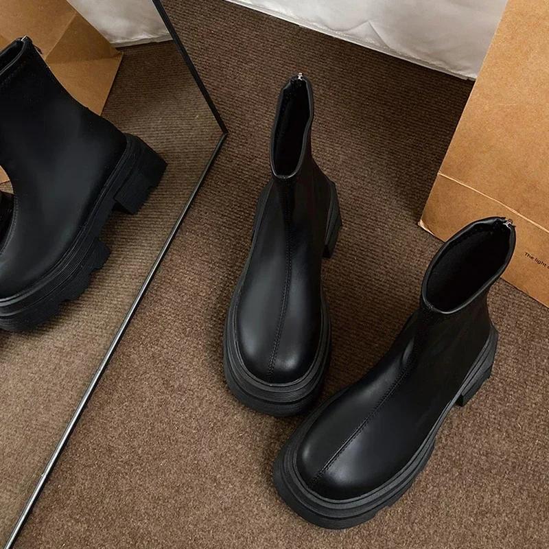 Осень Зима Ботильоны на платформе Женская мода Женские ботильоны на молнии сзади Британский стиль Женская обувь