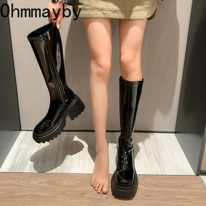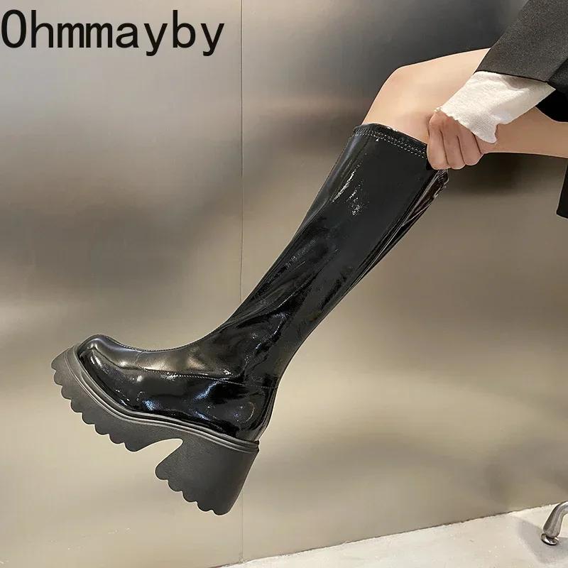 Женские сапоги до колен в стиле панк, модные лакированные кожаные длинные сапоги на молнии, новые осенне-зимние туфли на высоком каблуке для женщин