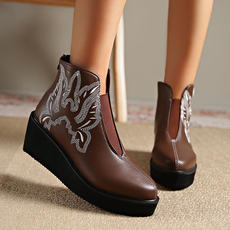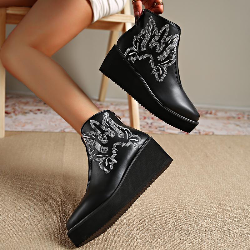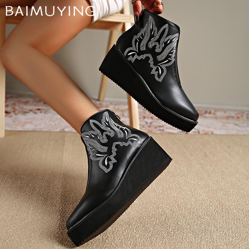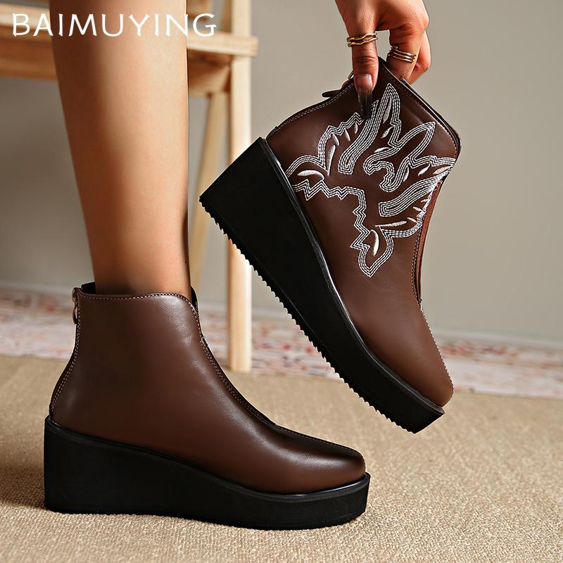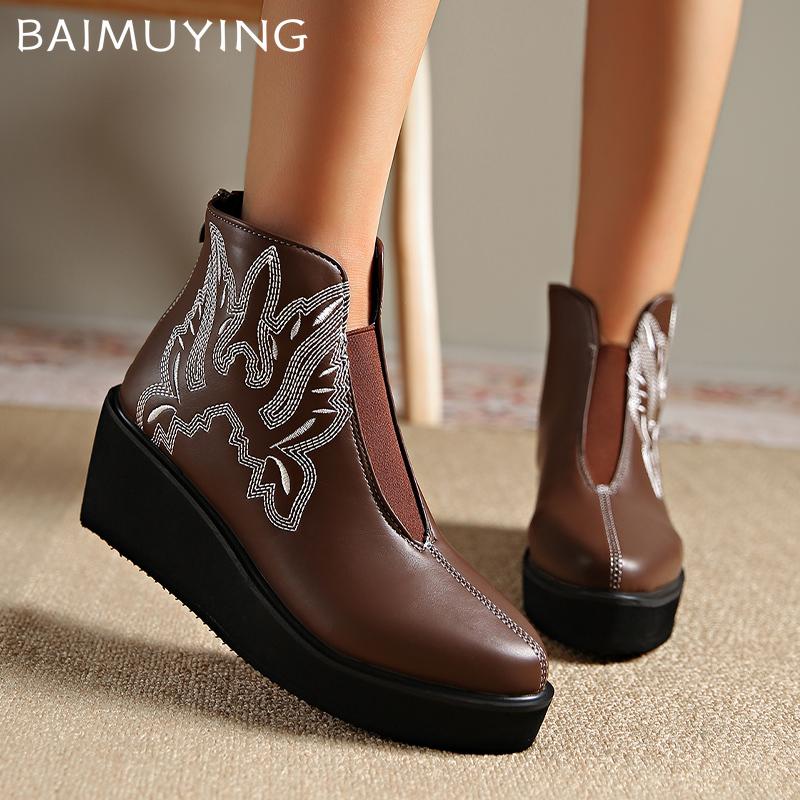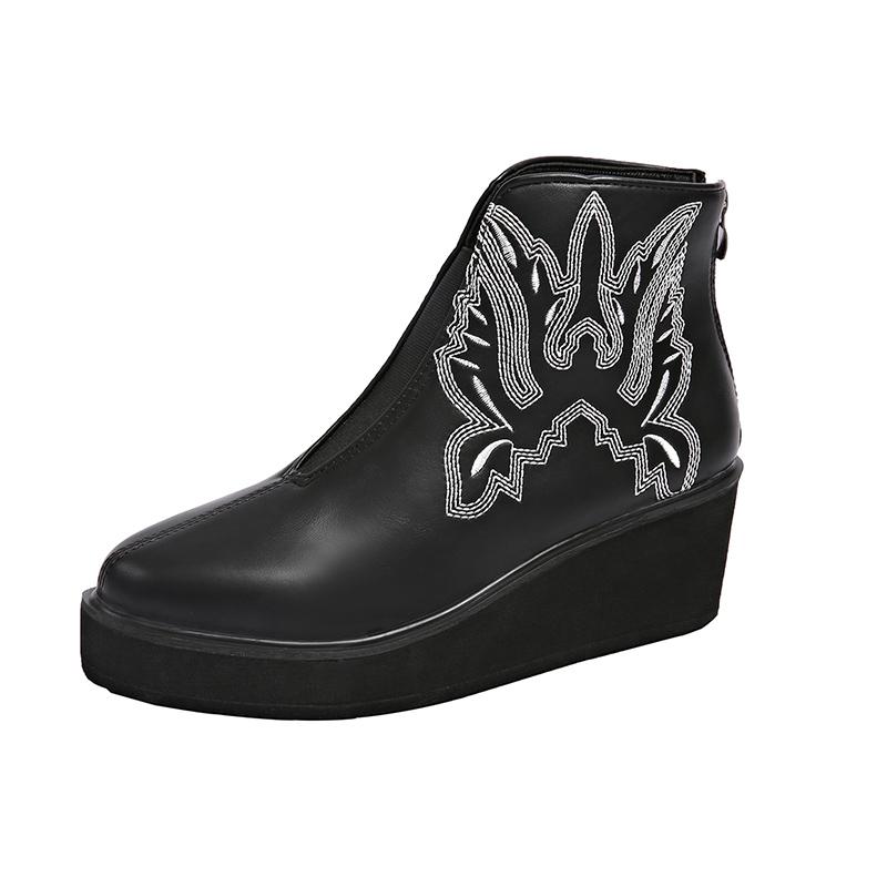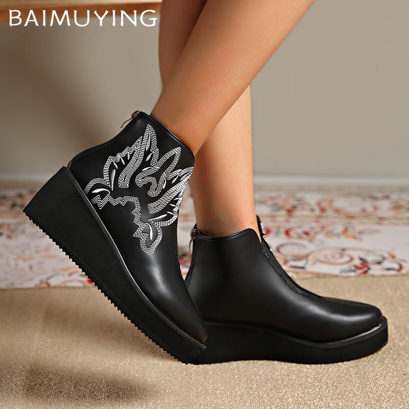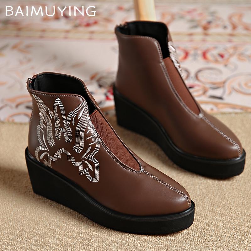 Женские ботильоны на танкетке с вышивкой Дизайнерские туфли в стиле ретро на среднем каблуке Трендовые зимние новые классические готические кожаные ботинки Botas De Mujer