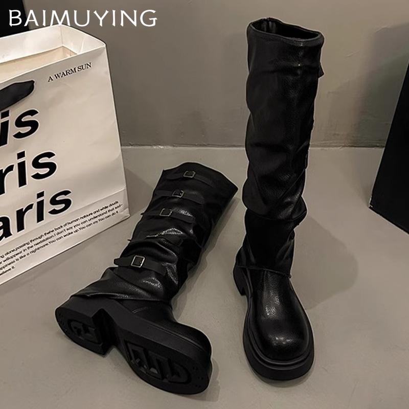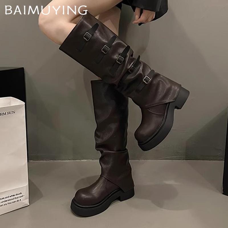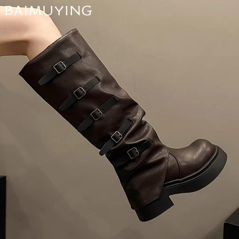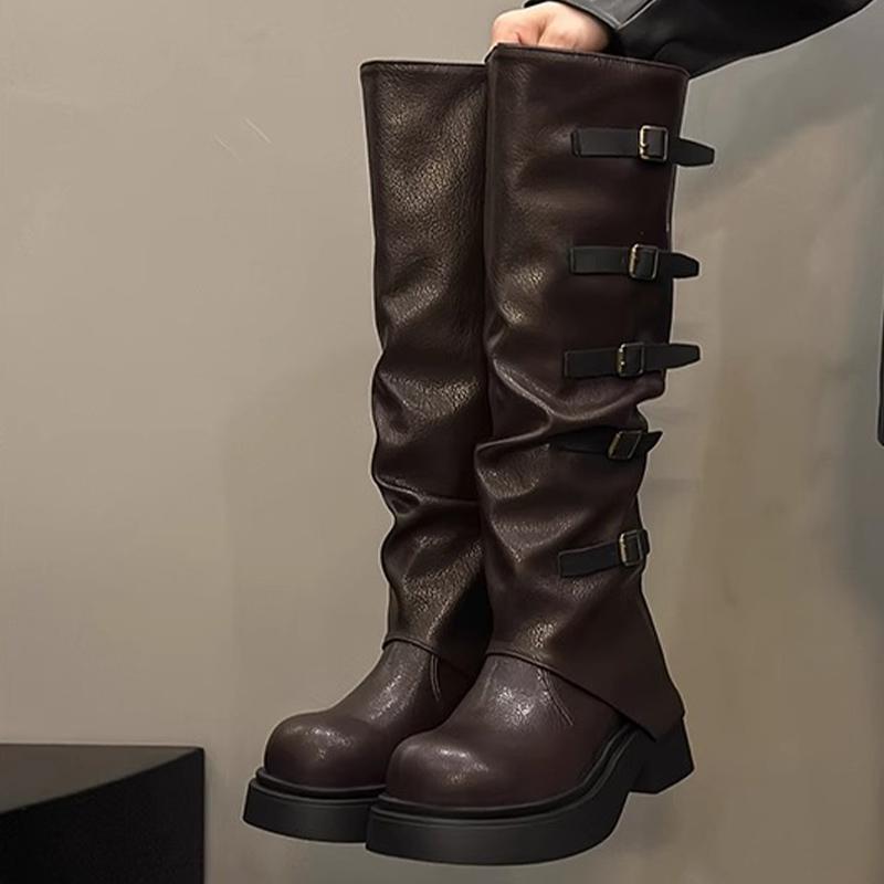 Женские высокие сапоги на толстой платформе, дизайнерские кожаные туфли на среднем каблуке с пряжкой, модные зимние туфли до колена в мотоциклетном стиле, женские ботинки