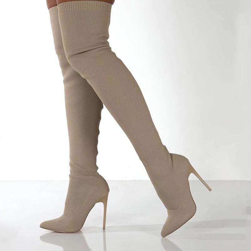 Женские осенние сапоги выше колена на шпильках с высоким каблуком, эластичные вязаные туфли-трубы бежевого и черного цвета в ретро-стиле, сексуальные, женские