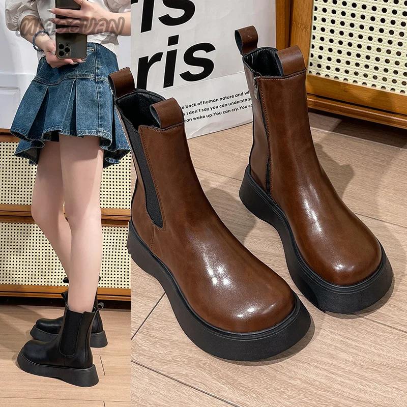 Коричневые женские короткие ботинки в стиле ретро с толстой подошвой, повседневные, осенние, модные, универсальные, ботинки челси, без застежек на платформе, мотоциклетные ботинки
