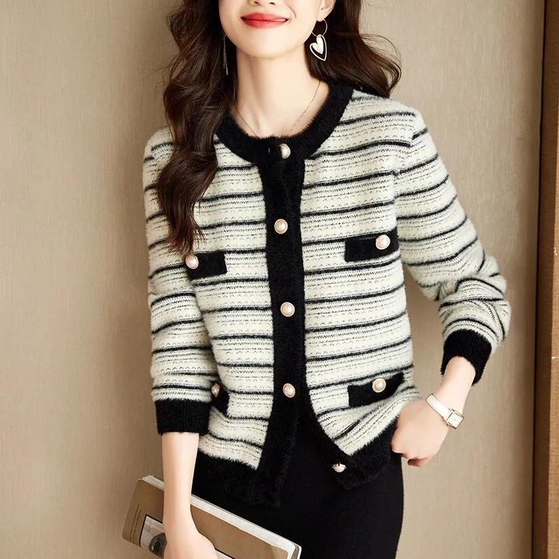 Корейская осенне-зимняя вязаная куртка женская повседневная с длинным рукавом в полоску имитация норки бархатный кардиган свитер женский топы — купить товар онлайн с бесплатной доставкой по всему миру!