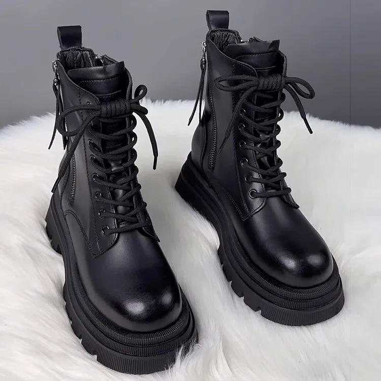 Черные мотоциклетные ботильоны на толстой подошве в стиле панк, женские весенние ботильоны на шнуровке, толстый каблук, ремень с пряжкой и карманами, дизайнерские массивные туфли