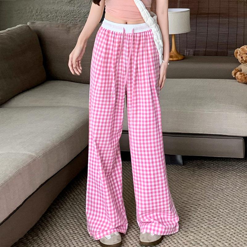 Ретро-сращивание Collision Color Plaid Loose Drag Ground Casual Women Tide Wide Leg Брюки