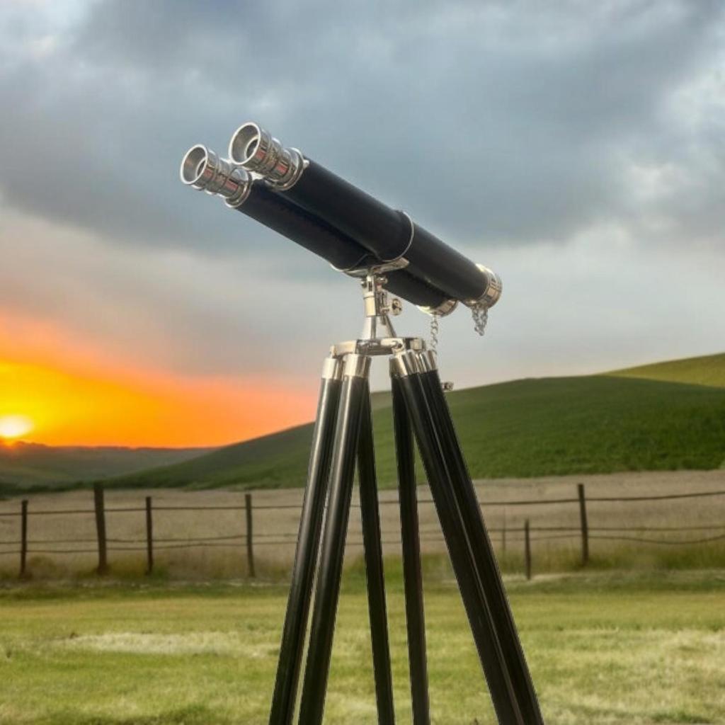 Морской бинокль из латуни 1920-х годов с деревянным штативом - Морской декор в винтажном стиле - Старинный латунный бинокль на деревянной подставке