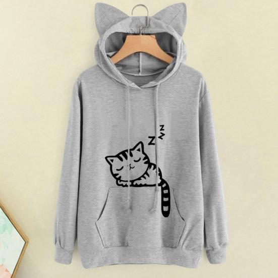 Симпатичный дизайн уха кошки: Выделитесь очаровательным украшением в виде кошачьих ушек на капюшоне и принтом в виде ползущего кота на нагрудном кармане этой женской толстовки с длинными рукавами.