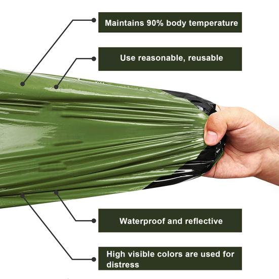 Этот спальный мешок для экстренных ситуаций, предназначенный для поддержания температуры тела, просто необходим во время кемпинга, походов или выживания на открытом воздухе в экстремальных погодных условиях.. Этот спальный мешок с подогревом обеспечит надежную защиту независимо от того, сталкиваетесь ли вы с метелью, проливным дождем или морозом.