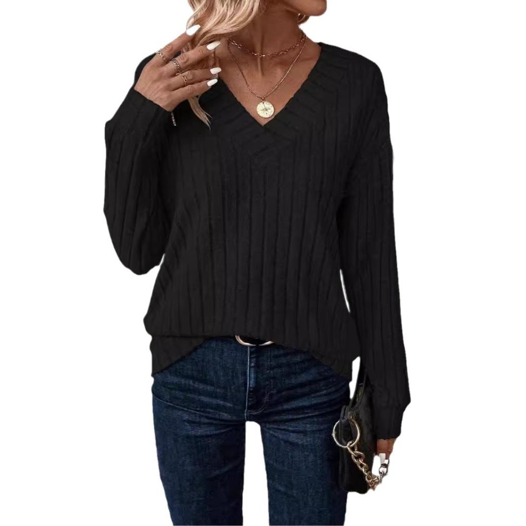 Осенний женский трикотажный повседневный однотонный топ с длинным рукавом и V-образным вырезом больших размеров