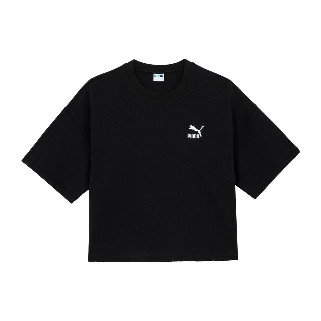 Puma Футболка Classics Court Girl с коротким рукавом и принтом логотипа сзади, повседневная вышивка, круглый вырез, женские топы, черный цвет 622963-01