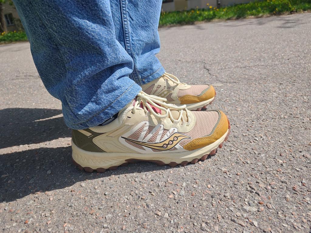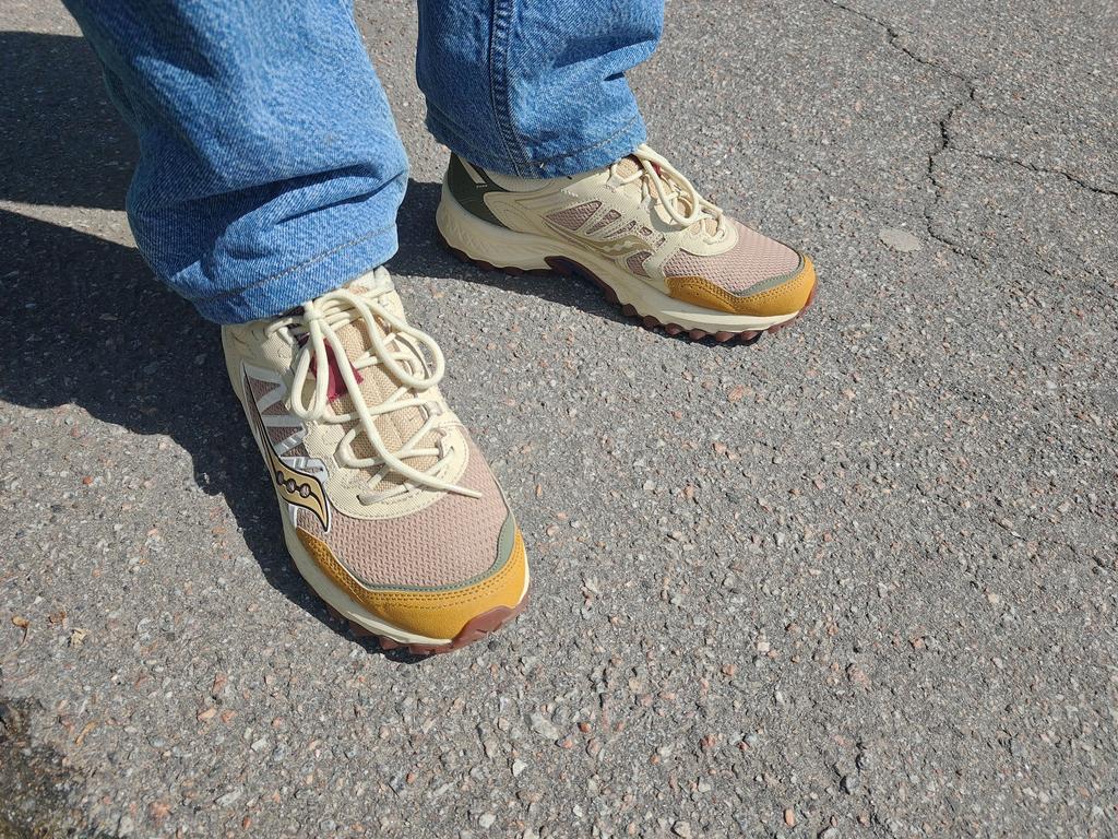 Т.к., saucony обычно маломерят, на стопу 27 см, взял на полразмера больше - us 9,5 (43. Длина стельки 28). Кроссовки сели хорошо, с запасом мм 5-7 в носке (фото №2, палец в области большого). По ширине тоже хорошо, хотя поначалу на одной ноге был легкий дискомфорт в области мизинца. Минусы: 1) маломерят, не на широкую ногу; 2) нет защиты большого пальца, из-за чего сетка протрется (фото №1); 3) возможны сложности с чисткой, хотя большая часть материалов это синтетика (по ощущениям как резина); 4) носок не усилен, мягкий, что будет сказываться на внешнем виде. Плюсы: 1) в данной серии, наверное одна из самых прикольных, универсальных расцветок; 2) хорошая вентиляция, подойдет на теплую погоду; 3) удобные, нога сидит плотно, пена средней жесткости; Добавлю, что пена светло-бежевого цвета. В общем, за 7к, пока, полностью доволен покупкой.