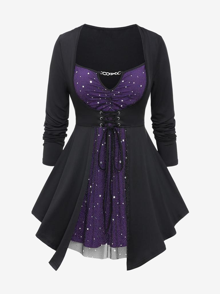 Футболка Rosegal Plus Size со звездами, шнуровкой, вырезом, цепочкой, длинными рукавами, 2 в 1 — купить товар онлайн с бесплатной доставкой по всему миру!