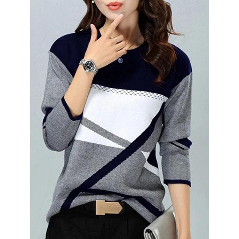 Женская шикарная футболка, модная, цветная, контрастная, с геометрическим принтом, топы, женская, осень-зима, с круглым вырезом, с длинным рукавом, свободные, большого размера, футболки 5XL