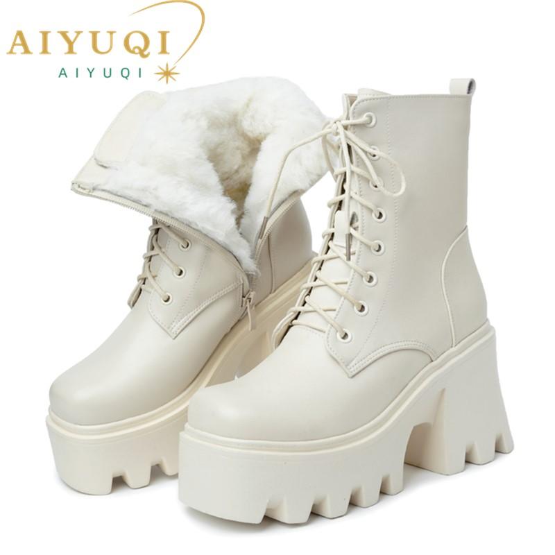 Женские ботильоны на платформе с высоким каблуком из натуральной кожи и шерсти, теплые зимние ботинки, женские модные байкерские ботинки со шнуровкой для женщин — купить товар онлайн с бесплатной доставкой по всему миру!