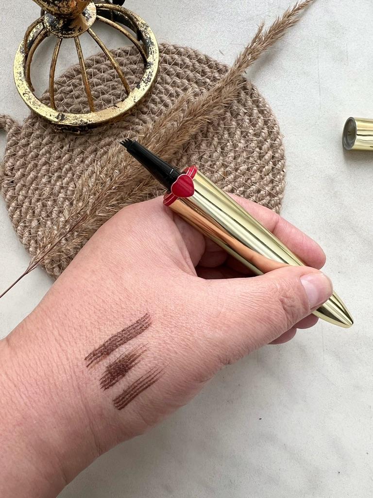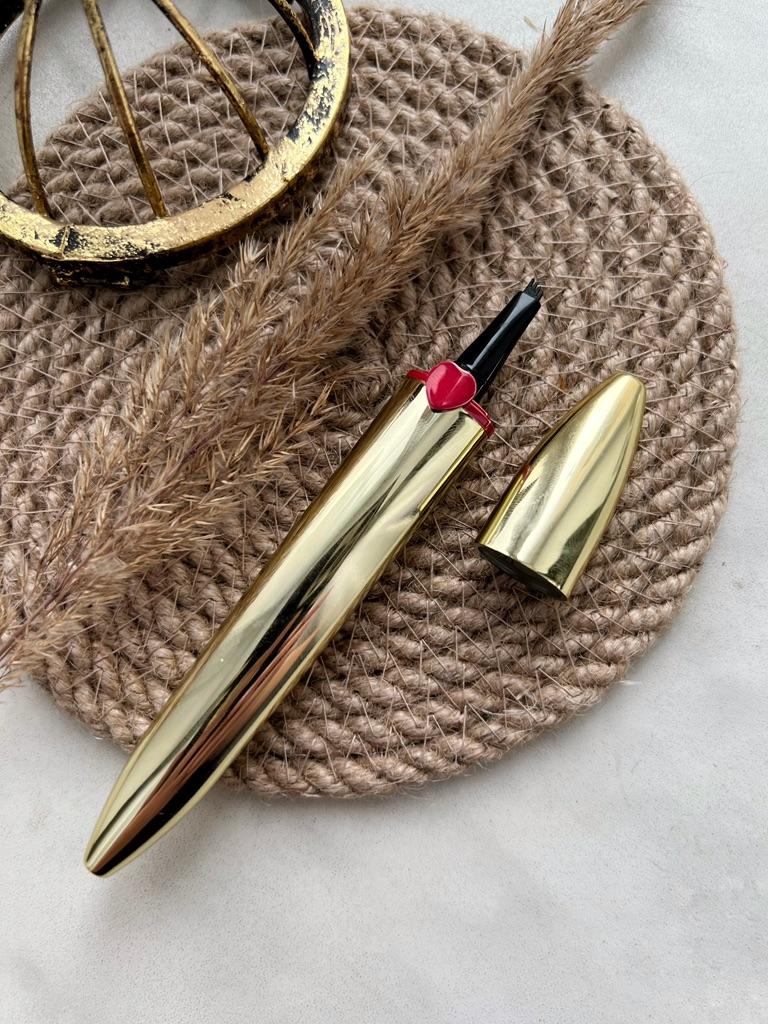 Жидкий карандаш для бровей с вилкой. Очень удобная штука я вам скажу. Я купила в темно коричневом цвете, есть черный. Отлично прорисовывает брови с эффектом 3D. Стильный и красивый на вид. В золотом футляре с сердечком. Я уже пользовалась подобными карандашами. Знаю что его нужно хорошо закрывать, иначе быстро сохнет. А так же перед применением встряхивать и тогда он прослужит долго. Мне очень понравился.