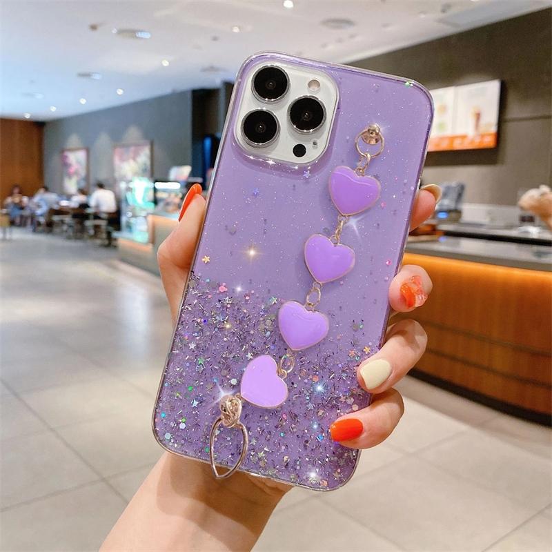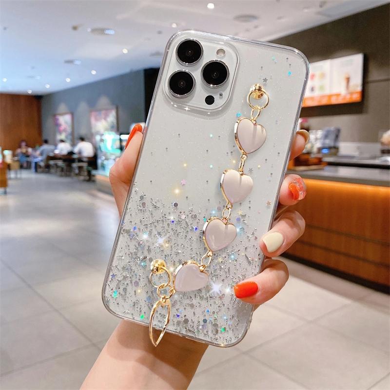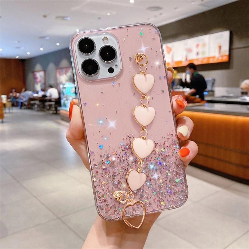 Чехол-цепочка Love Heart с блестками для iPhone 15 11 12 13 14 Pro Max Mini 7 8 Plus X Xr Xs 15pro 14plus, силиконовый чехол-браслет