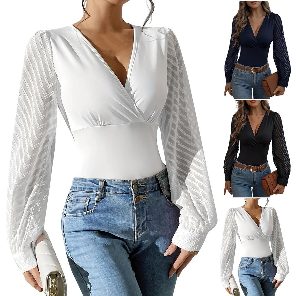 Женская и зимняя мода повседневный шифоновый сращивающийся однотонный трикотажный топ с глубоким V-образным вырезом и длинными рукавами — купить товар онлайн с бесплатной доставкой по всему миру!