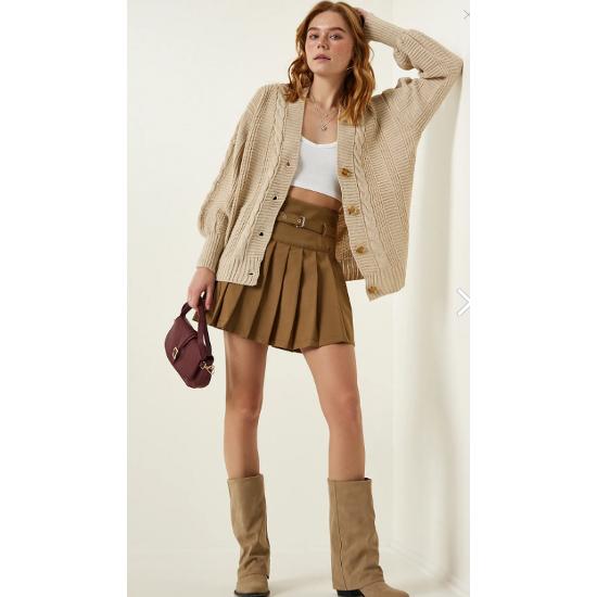Kadın Krem Örgülü Balon Kollu Salaş Triko Hırka Standart Beden
