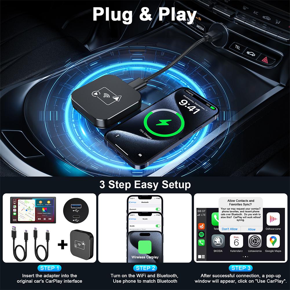 2. Автоматическое беспроводное соединение: Поддерживайте порядок на панели приборов с помощью смарт-приставки CarPlay. Для подключения телефона к автомобилю больше не нужны USB-кабели. Он автоматически подключается к вашему телефону без задержек, преобразуя заводское проводное соединение CarPlay/Android Auto в беспроводное для более удобного использования..