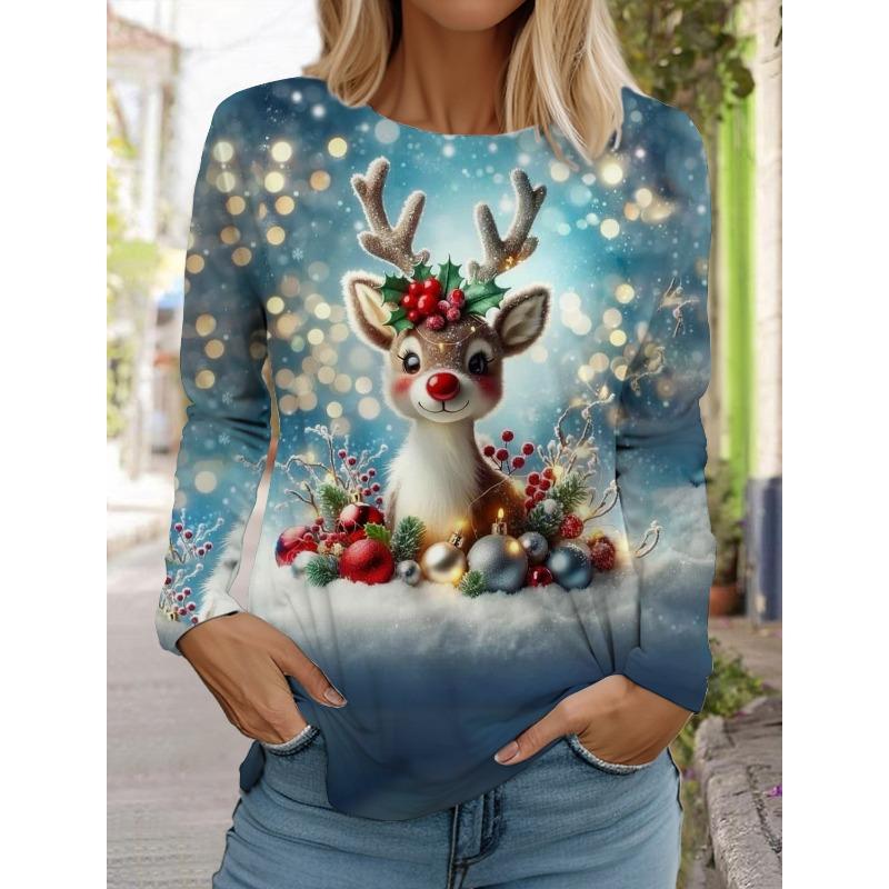 Женская футболка с длинным рукавом и рождественским принтом оленей, спортивный повседневный милый полиэстер с круглым вырезом и длинным рукавом — купить товар онлайн с бесплатной доставкой по всему миру!