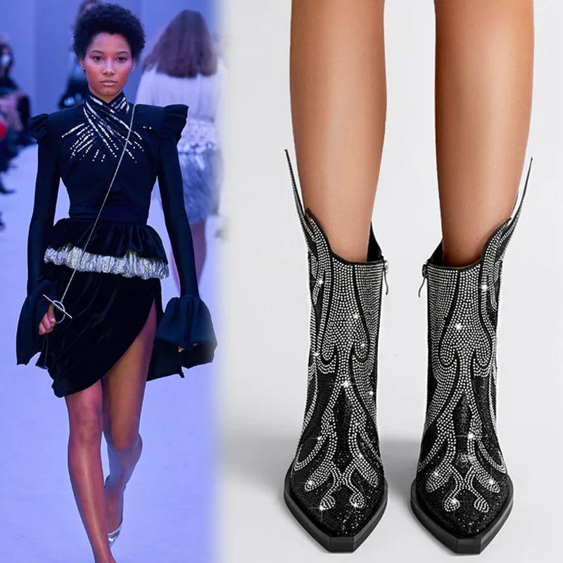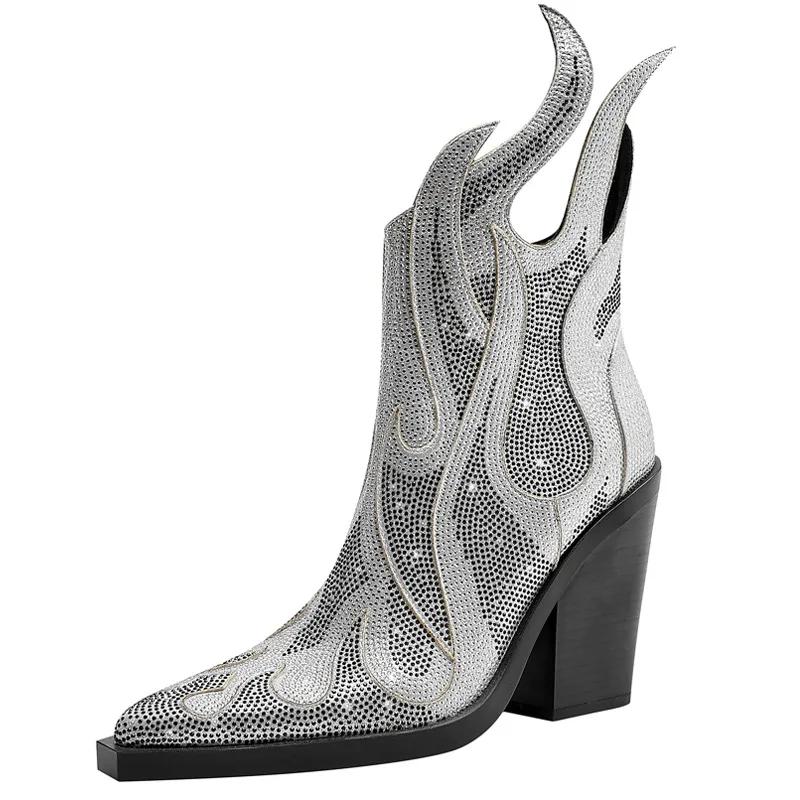 2024 Новые женские ботильоны с боковой молнией для сцены, сексуальные квадратные сапоги на толстом каблуке Water Diamond Flame 2024, сапоги большого размера