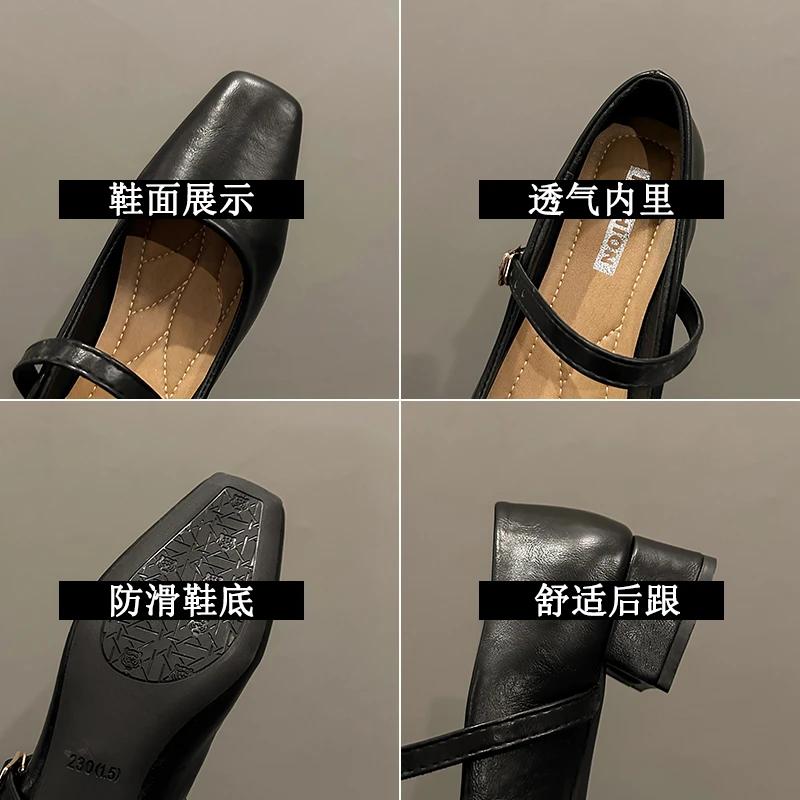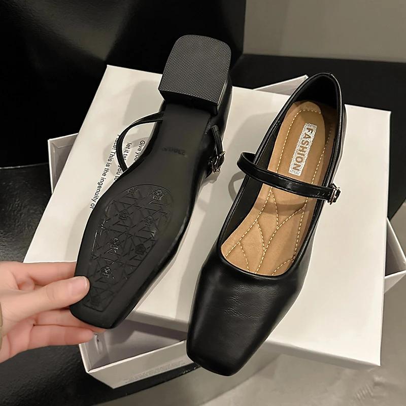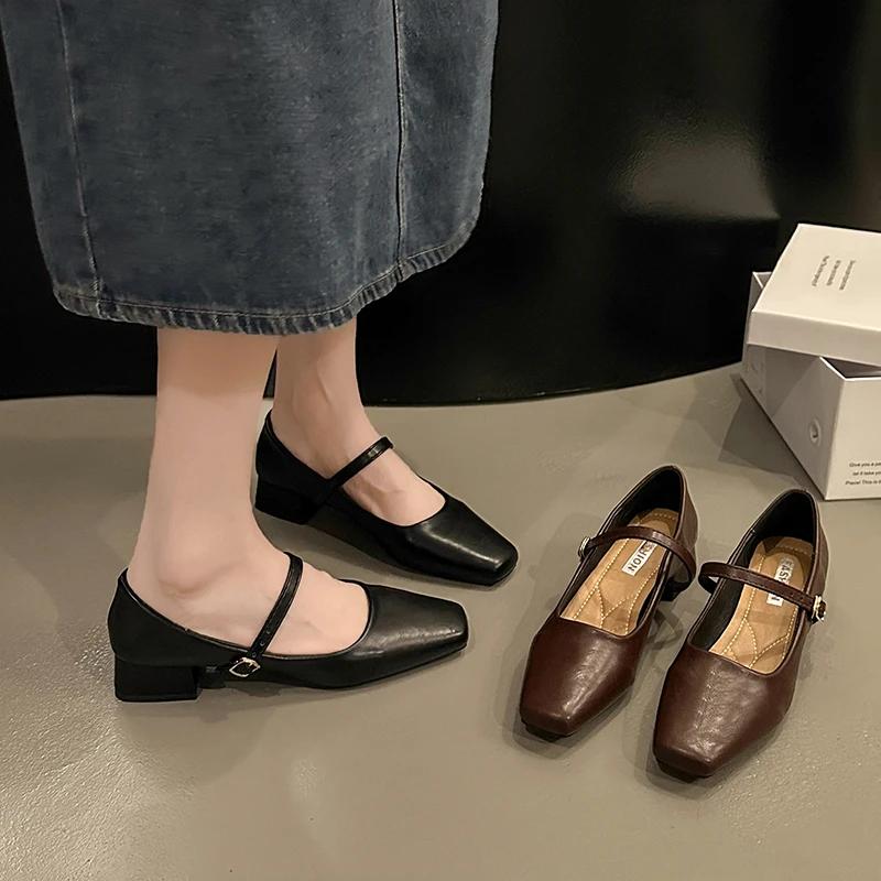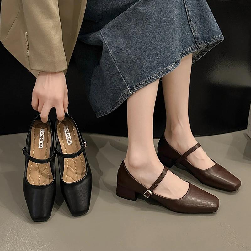 2024 Французские туфли Мэри Джейн Женские туфли-лодочки Весна Осень Средний каблук Толстый квадратный носок Мокасины на пуговицах Неглубокие черные коричневые женские каблуки