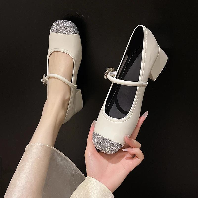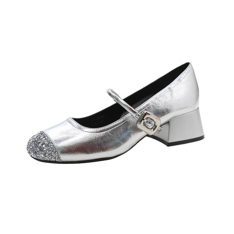 2024 2024 Дизайнерские женские туфли Мэри Джейн на серебристом каблуке с неглубокой пряжкой на толстом каблуке Женское платье Элегантные туфли-лодочки 2024 Лето