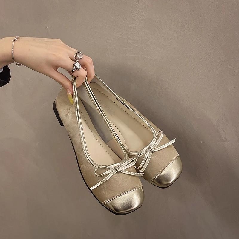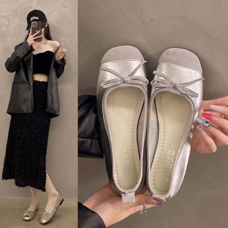 2024 Французские туфли с квадратным носком и бантом на плоской подошве 2024 года Новые осенние туфли Shallow Fairy Универсальные нежные офисные платья на низком каблуке Туфли-лодочки Женские балетки