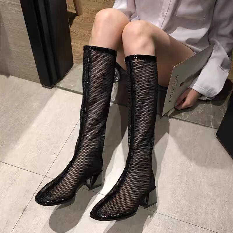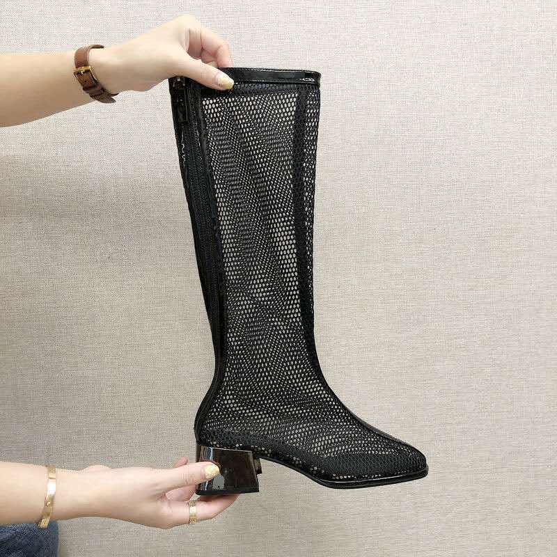 Женские летние сапоги, роскошные элегантные длинные туфли для женщин, тренд 2024 года, удобные сетчатые черные сапоги на каблуке для активного отдыха, модные высокие сапоги
