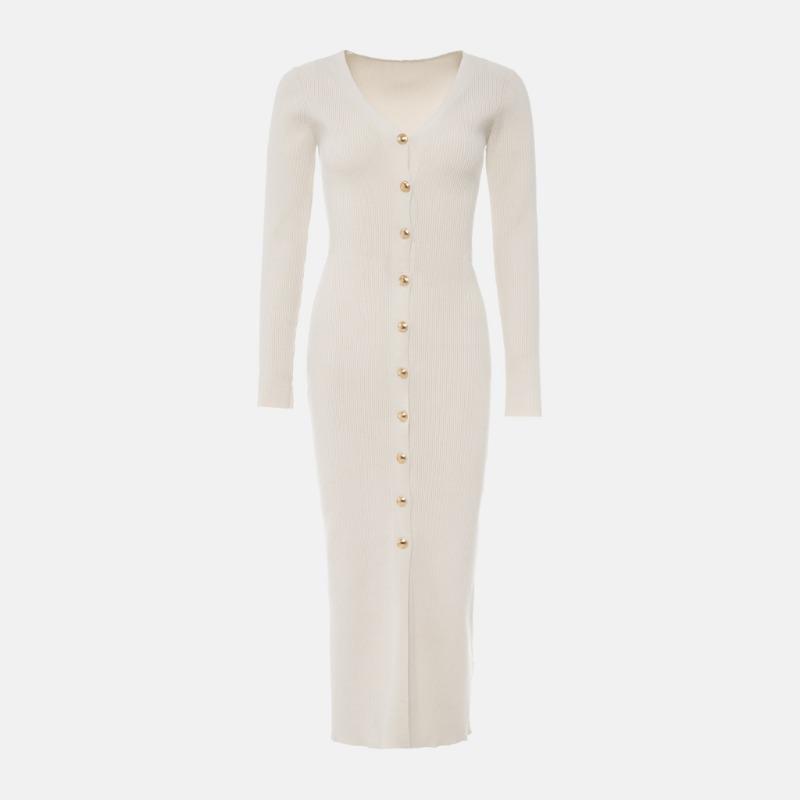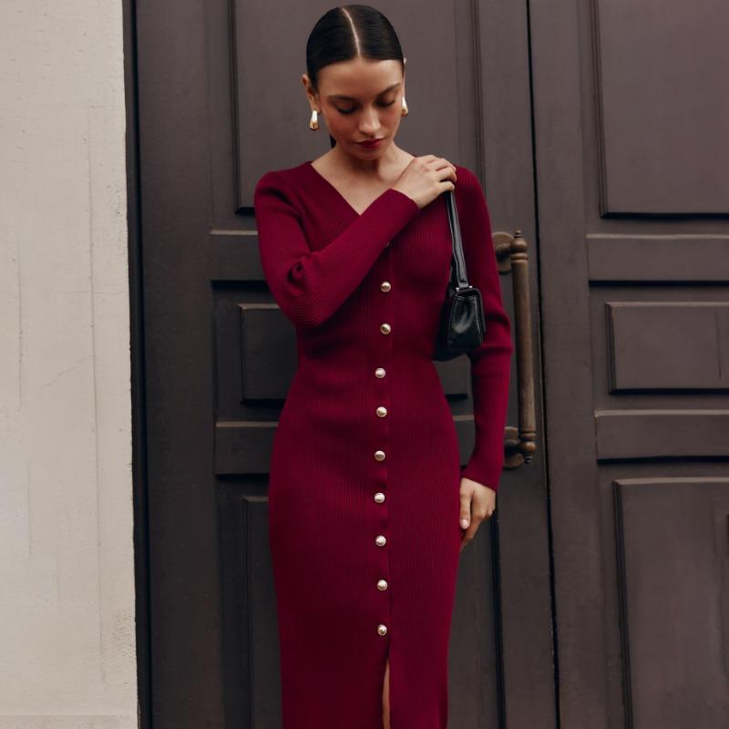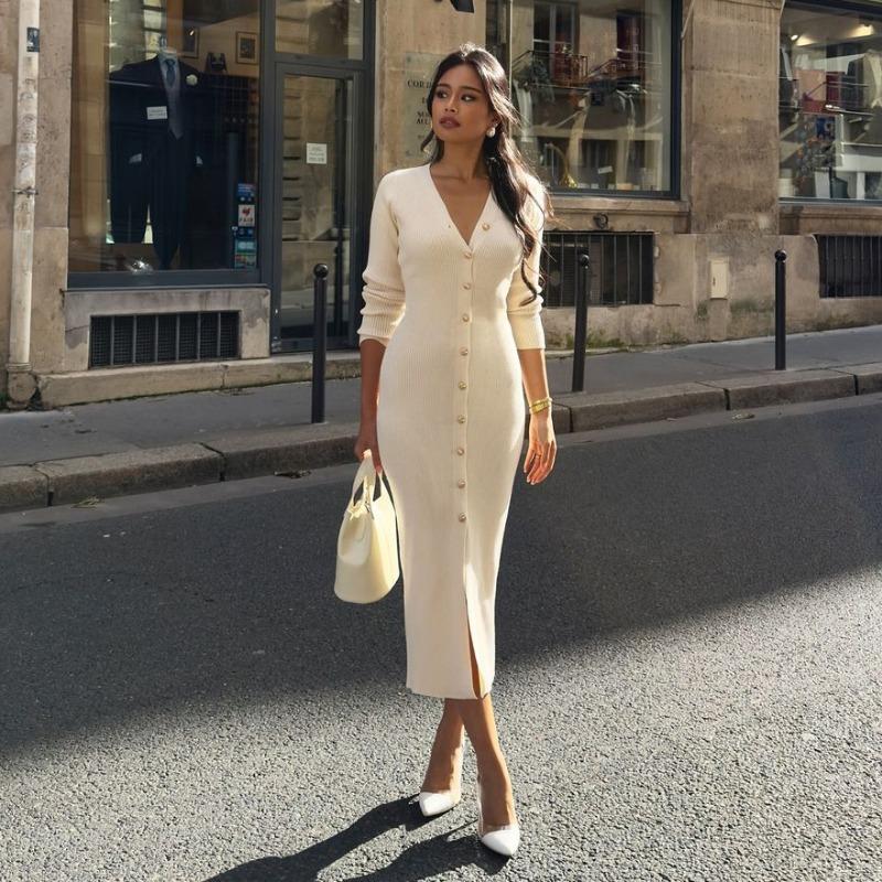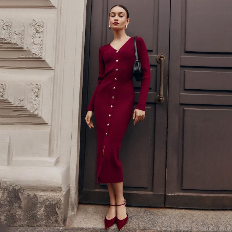 Повседневный длинный рукав трикотажное ребристое платье с пуговицами и разрезом женский свитер кардиган платья тонкий однотонный элегантный офисная женская одежда