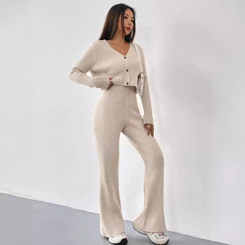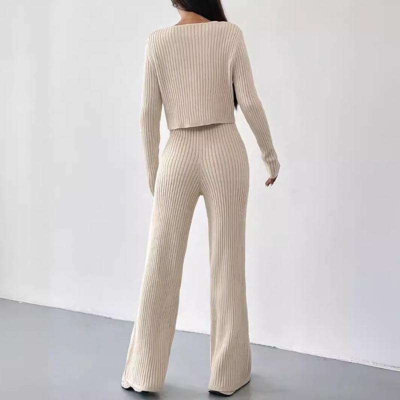 Осенне-зимняя женская мода повседневные прямые брюки темперамент свободный V-образный вырез полосатый трикотажный брючный костюм