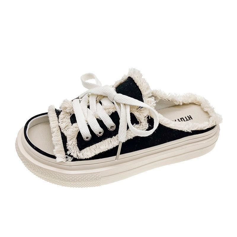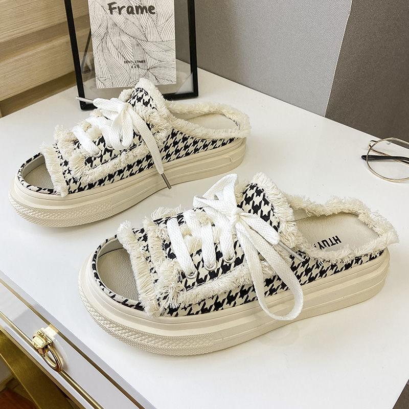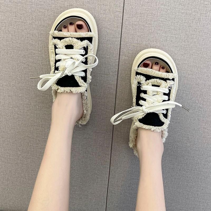 Женские парусиновые тапочки на плоской подошве, женская повседневная обувь на шнуровке, женские модные тапочки на платформе, женские джинсовые пляжные сандалии с открытым носком2024
