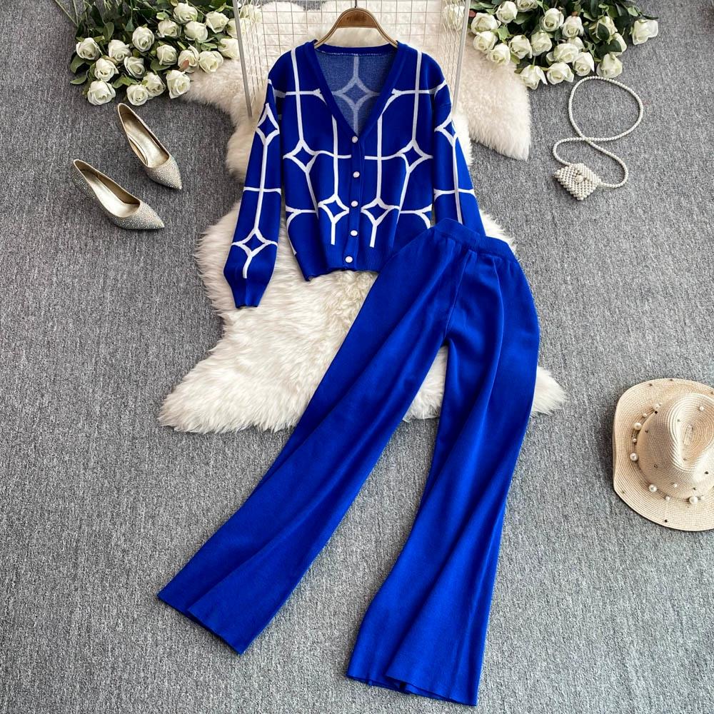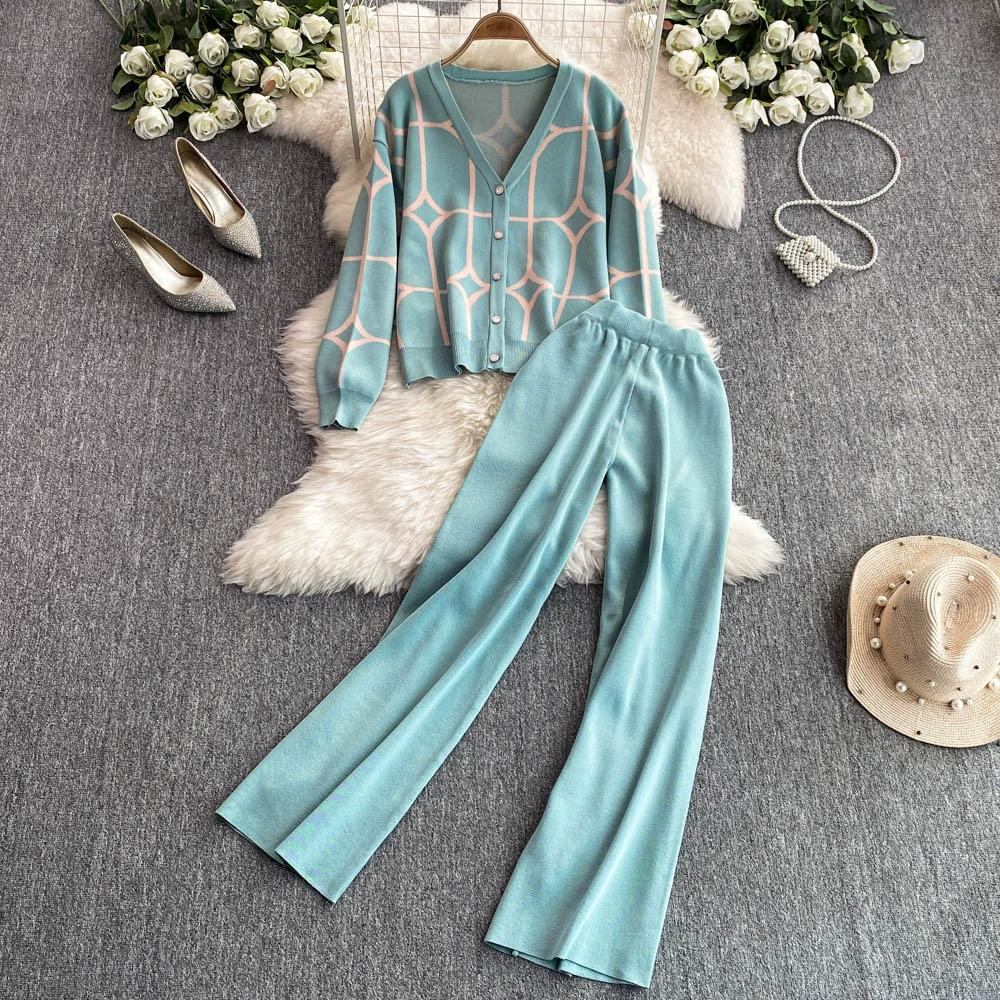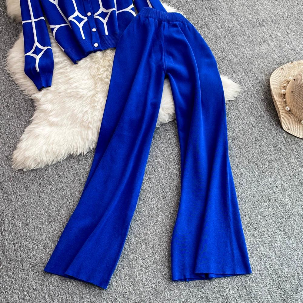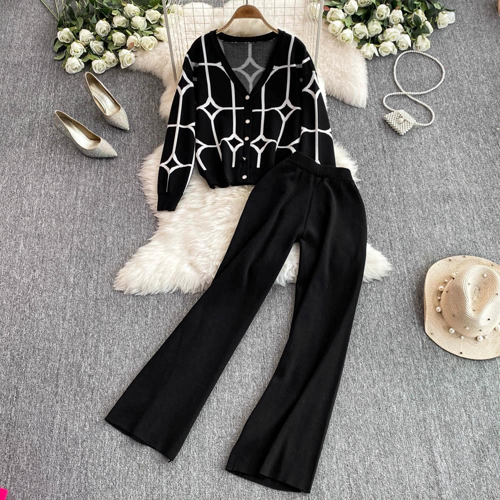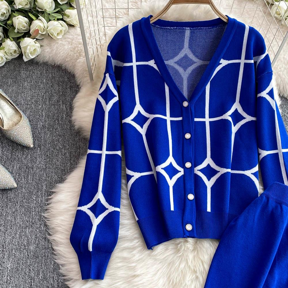 Осенне-зимний дизайнерский трикотажный свитер с брюками, комплект из двух предметов, женская куртка с V-образным вырезом, пальто и брюки длиной до щиколотки, спортивный костюм