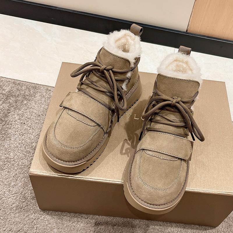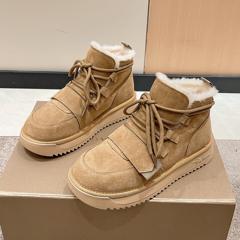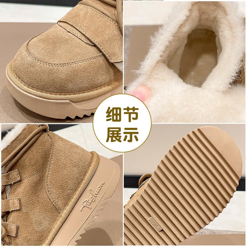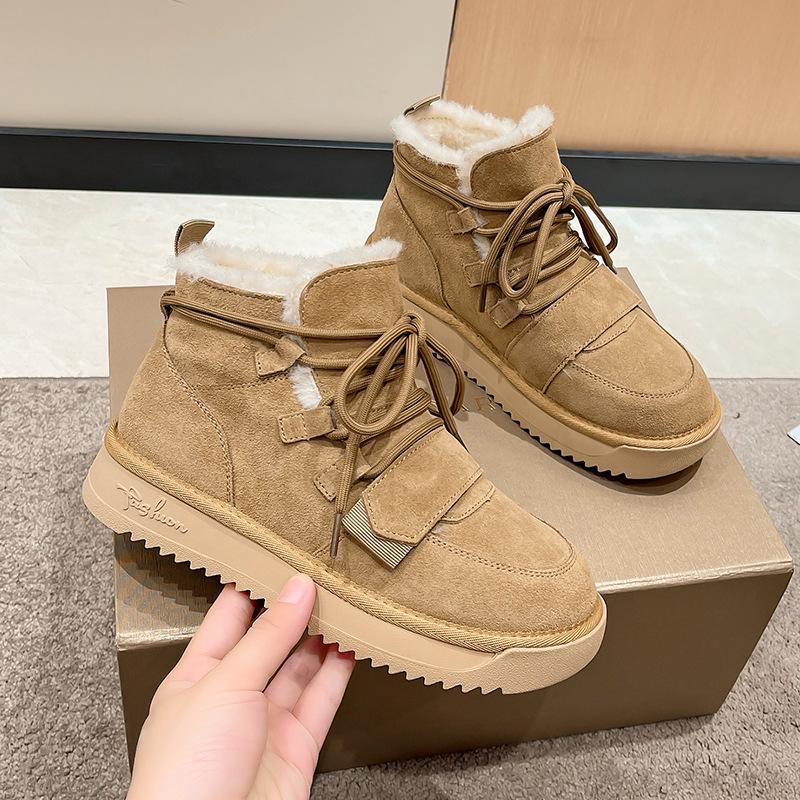 Зимние плюшевые женские зимние сапоги, нескользящие теплые женские сапоги, ботинки на шнуровке, на платформе и среднем каблуке, женские ботильоны из коровьей замши