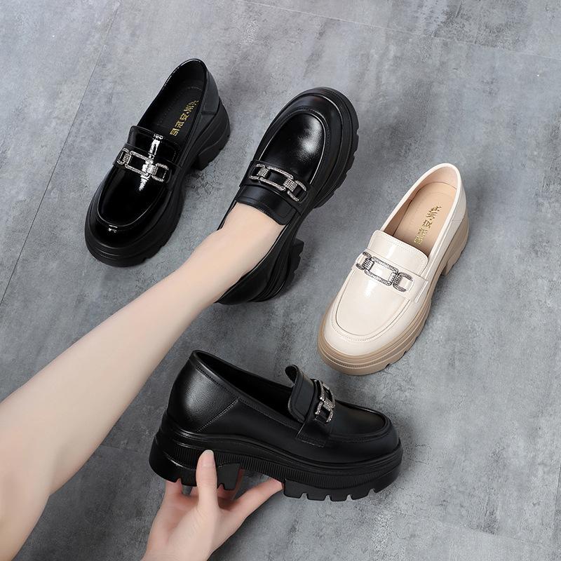 Мода Модные туфли на платформе Новые женские туфли Мягкая кожа Толстые каблуки Британский маленький круглый носок Металлические украшения Белые кожаные туфли