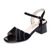 Мода Комфорт Мягкие кожаные сандалии Женские летние модные туфли для мам Толстый каблук Высокие каблуки Алмазный Нескользящий Черный Тонкие туфли
