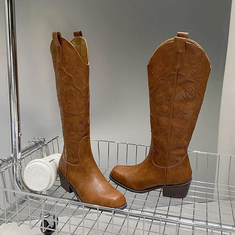Сапоги женские новые вышитые боковые молнии ковбойские сапоги женские коричневые ретро толстый каблук длинные сапоги Botas Mujer 2024